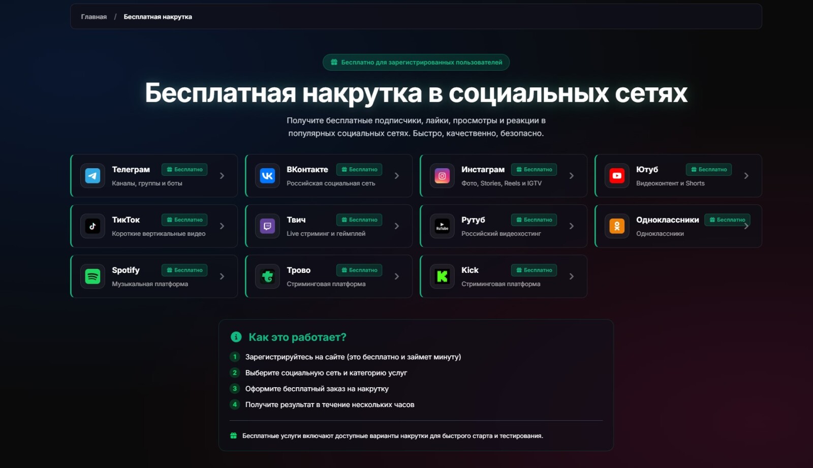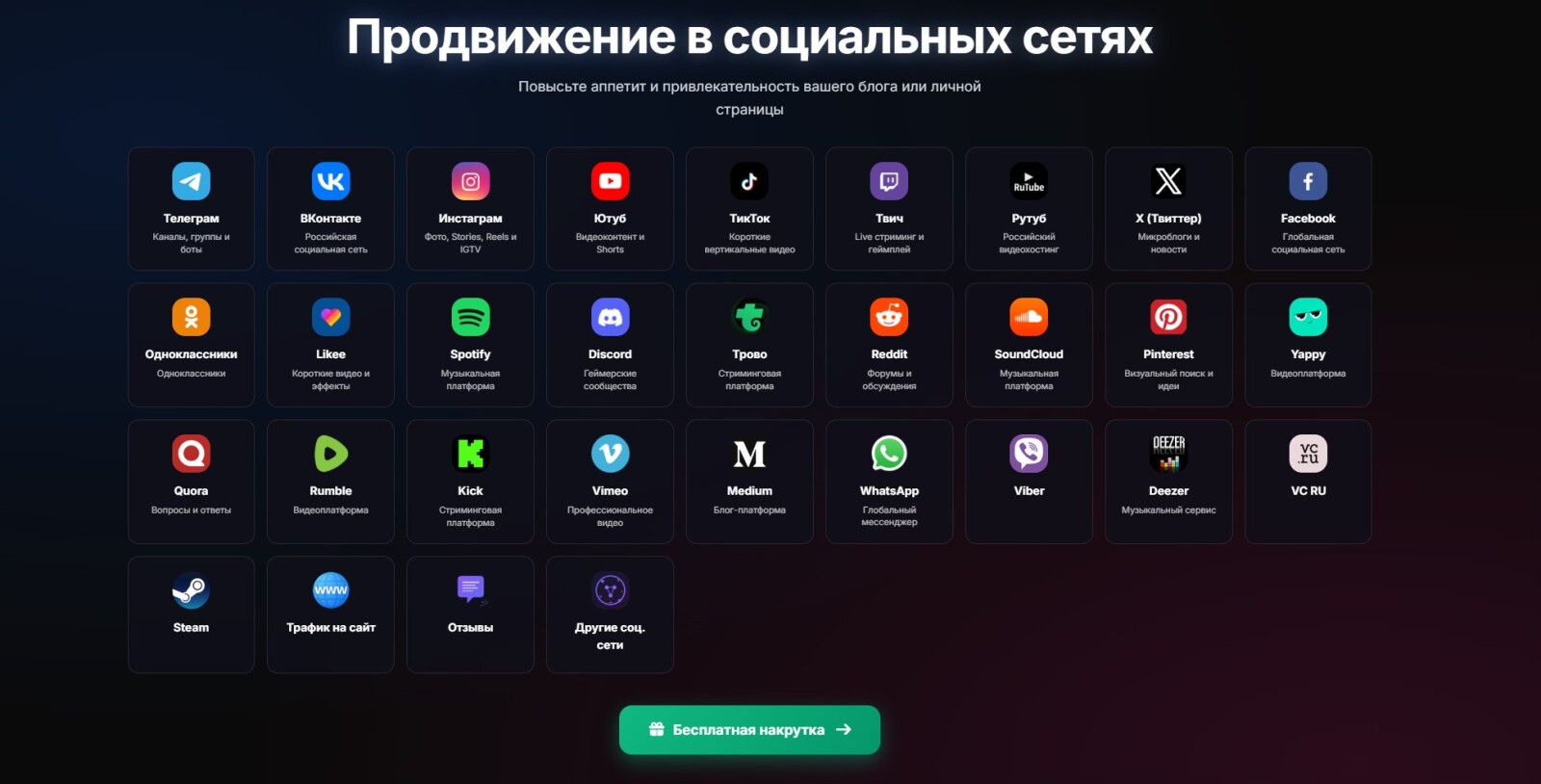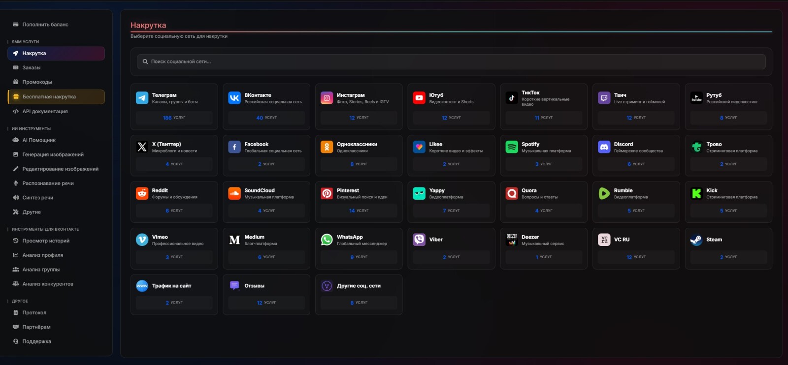 SMMRails - Сервис для накрутки более чем в 50 социальных сетях. Помимо накрутки, сервис также предоставляем множество инструментов для работы с СММ, работа с текстами (что особенно полезно для копирайтеров) и многое другое. На сервисе имеется бесплатная накрутка, которая позволяет бесплатно продвигать социальные сети, такие как Телеграм, ВКонтакте, Инстагрм*, Твич, Ютуб и др.